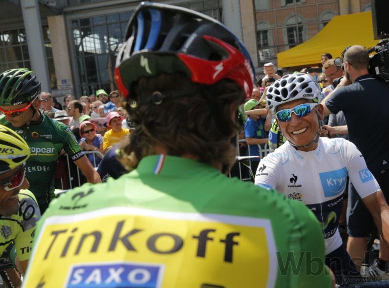 Slovenský cyklista Peter Sagan (v zelenom) sa rozpráva s Nairom Quintanom pred desiatou etapou Tour de France z Tarbes do La Pierre Saint Martin, ktorá meria 167 km. Foto: SITA/ AP