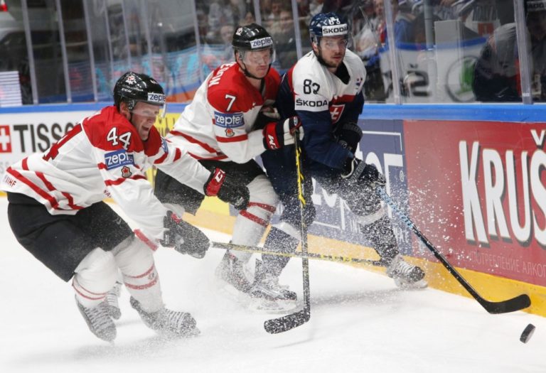 Rus Ivan Telegin (vľavo) počas zápasu A-skupiny proti Švajčiarsku na svetovom šampionáte v Rusku. Moskva, 14. máj 2016. Foto: SITA/AP
