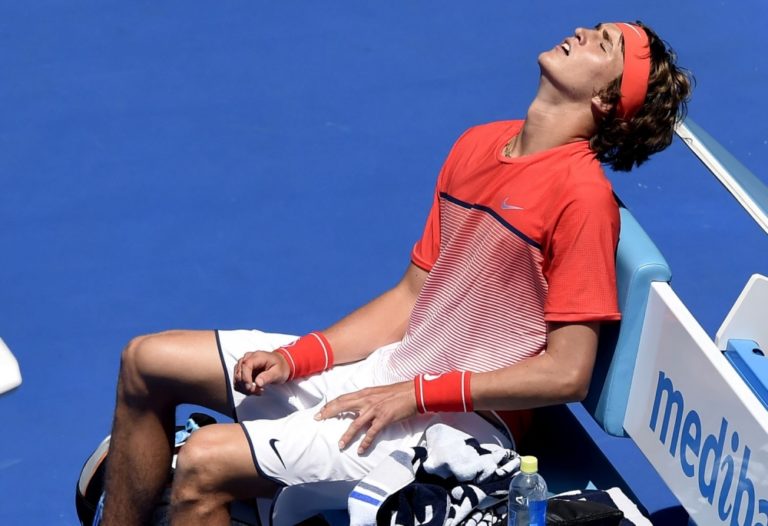 Nemecký tenista Alexander Zverev počas zápasu prvého kola Australian Open, v ktorom prehral s favoriziovaným Andym Murraym 1:6, 2:6, 3:6. Melbourne, 19. január 2016. Foto: SITA/AP