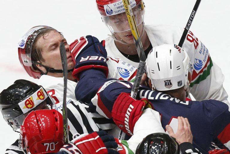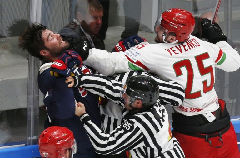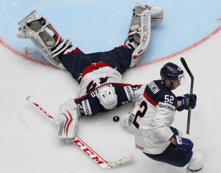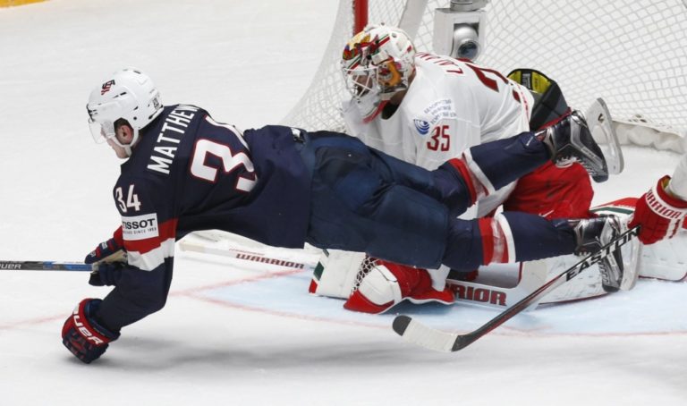 Americký hokejista Auston Matthews padá po útoku na bieloruskú bránku. Petrohrad, 7. máj 2016. Foto: SITA/AP