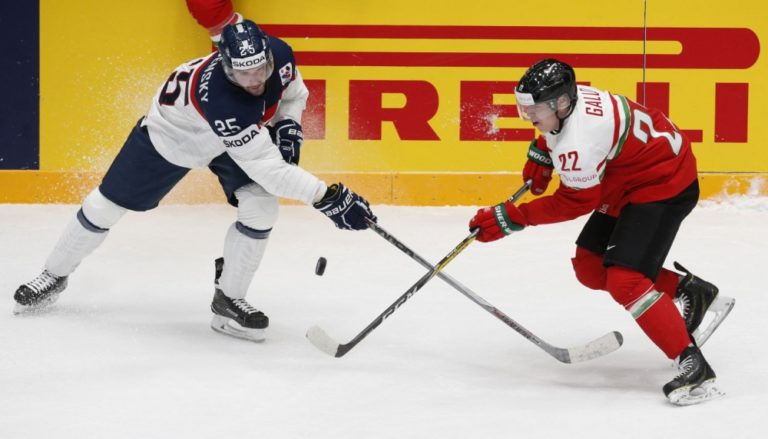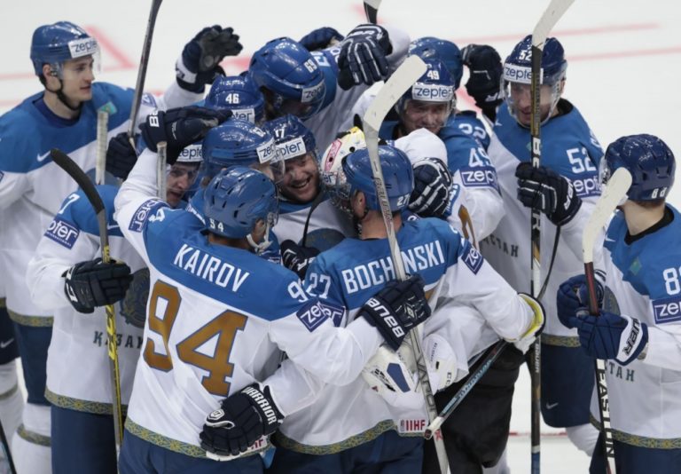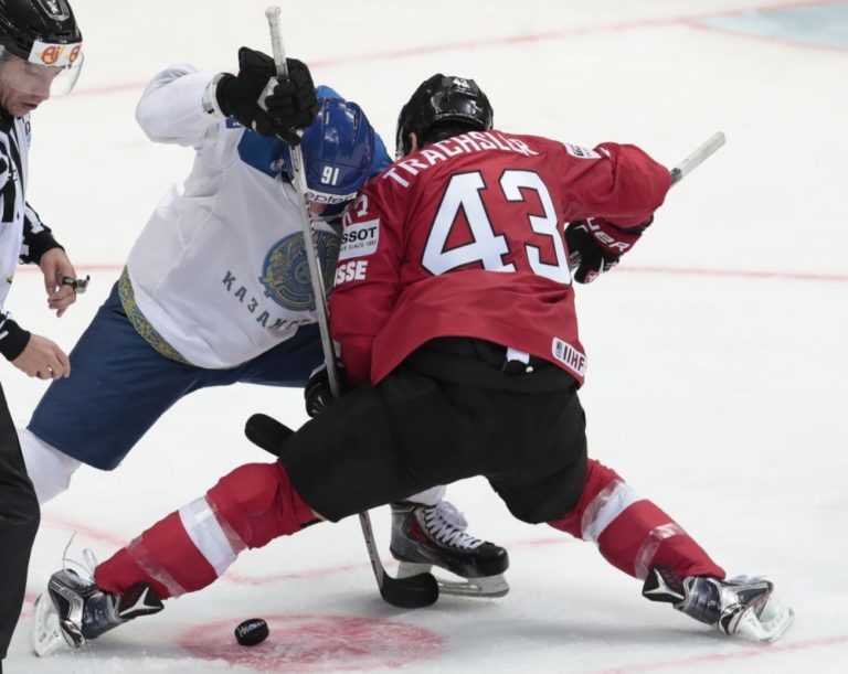 Konstantin Puškariov (Kazachstan) bojuje o puk so Švajčiarom Gaetanom Haasom počas druhej tretiny zápasu na svetovom šampionáte. Moskva, 7. máj 2016. Foto: SITA/AP
