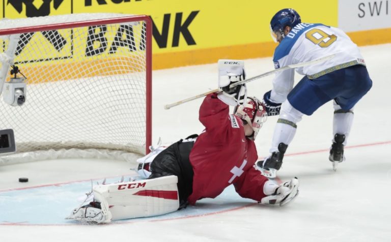 Nigel Dawes (Kazachstan) strieľa víťazný gól do siete švajčiarskeho brankára Reta Berru. Moskva, 7. máj 2016. Foto: SITA/AP