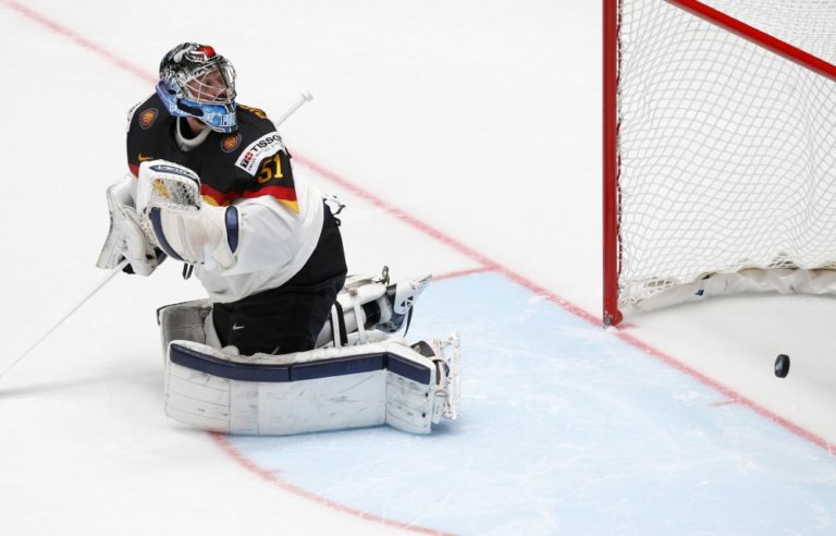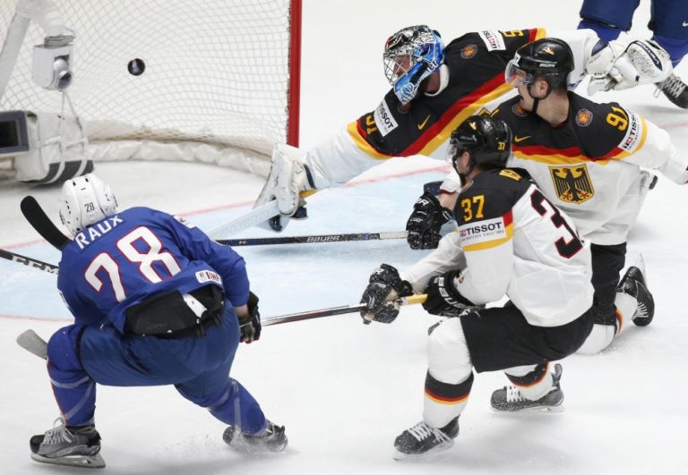 Francúz Pierre-Edouard Bellemare sa snaží streliť gól do siete nemeckého brankára Tima Pielmeiera na svetovom šampionáte. Petrohrad, 7. máj 2016. Foto: SITA/AP