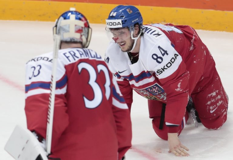 Český hokejista Tomáš Kundrátek krváca po tom, ako bol počas druhej tretiny zápasu proti Lotyšsku zasiahnutý do hlavy. Moskva, 7. máj 2016. Foto: SITA/AP