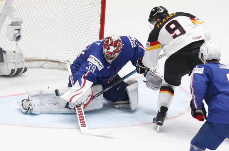 Nemec Jerome Flaake útočí na sieť francúzskeho gólmana Cristobala Hueta počas svetového šampionátu. Petrohrad, 7. máj 2016. Foto: SITA/AP