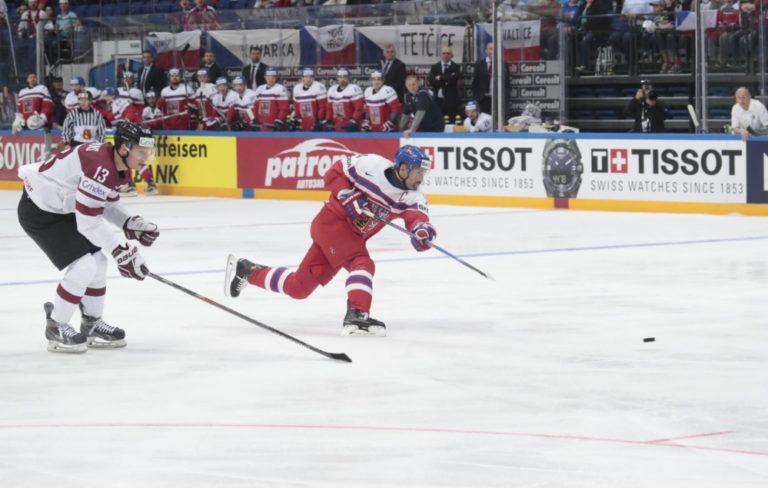Český hokejový útočník Tomáš Plekanec dáva svoj druhý gól Lotyšsku na svetovom šampionáte. Moskva, 7. máj 2016. Foto: SITA/AP