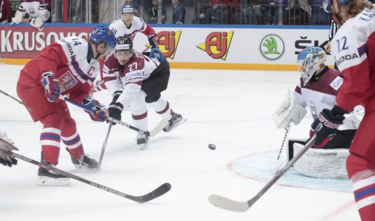 Český hokejový útočník Tomáš Plekanec dáva svoj prvý gól Lotyšsku na svetovom šampionáte. Moskva, 7. máj 2016. Foto: SITA/AP