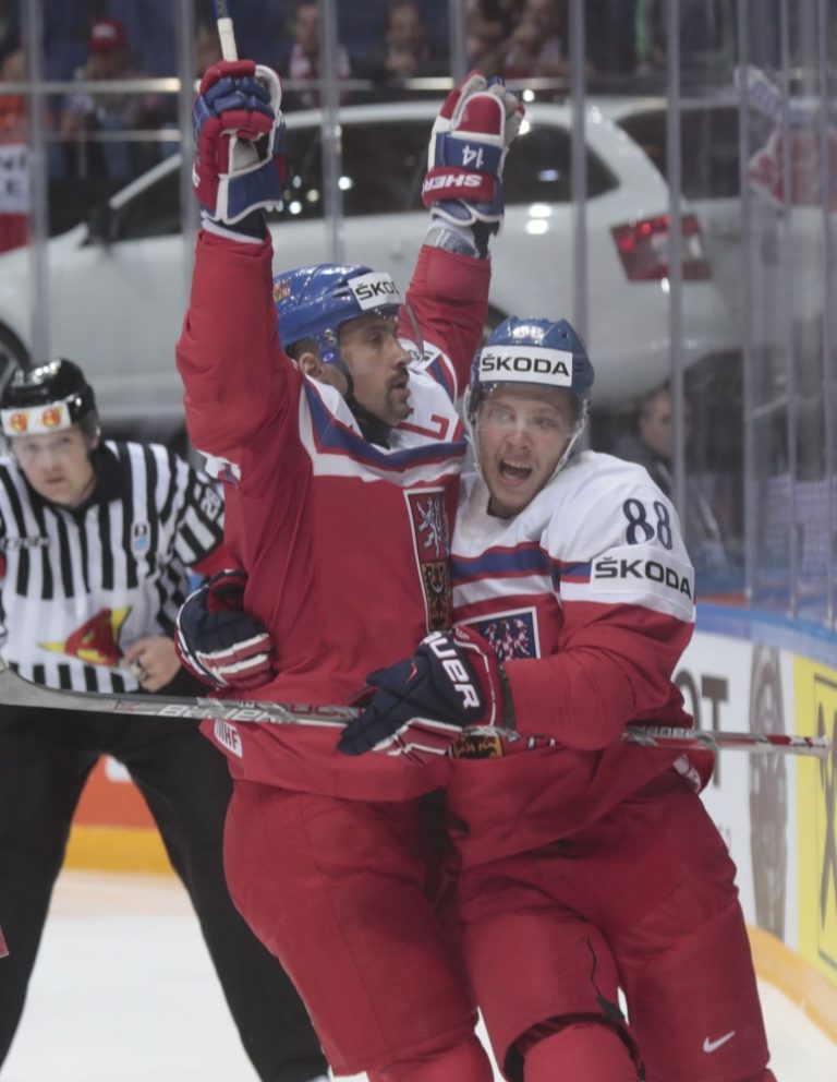 Český hokejový útočník Tomáš Plekanec sa raduje zo svojho druhého gólu Lotyšsku na svetovom šampionáte. Moskva, 7. máj 2016. Foto: SITA/AP