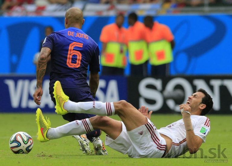 Španiel Sergio Busquets v súboji s holandským futbalistom Wesleym Sneijderom počas piatkového zápasu B-skupiny na MS vo futbale. Foto: SITA/AP