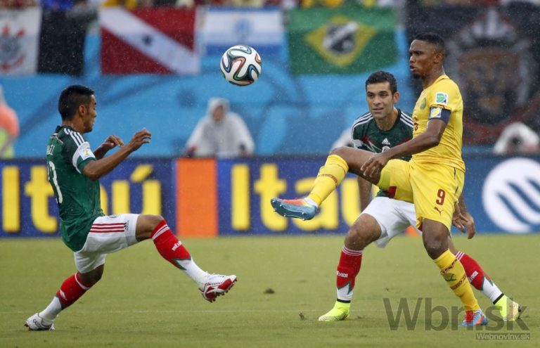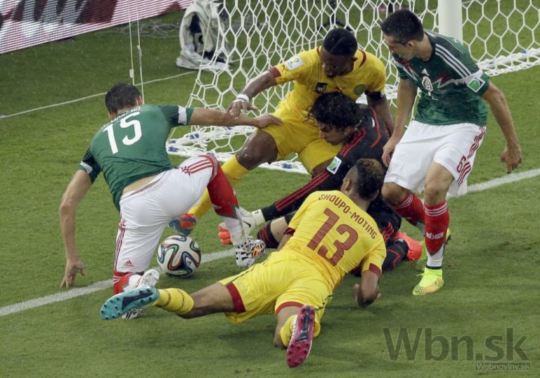 Kamerunskí futbalisti Maxim Choupo-Moting a Samuel Eto’o v súboji s Mexičanmi Hectorom Morenom a Diegom Reyesom pred brankárom Guillermom Ochoaom počas piatkového zápasu A-skupiny na MS vo futbale. Foto: SITA/AP