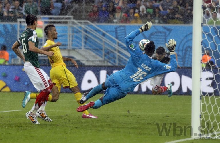 Mexický brankár Guillermo Ochoa chytá loptu po strele Kamerunčana Maxima Choupo-Motinga počas piatkového zápasu A-skupiny na MS vo futbale. Foto: SITA/AP