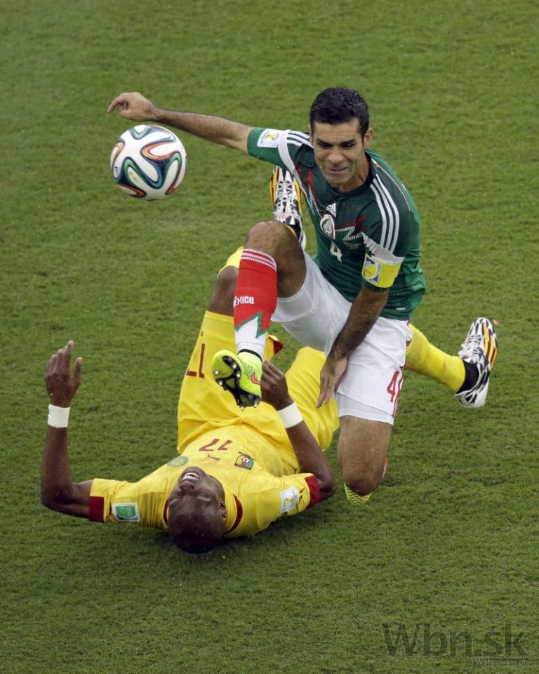 Mexický futbalista Oribe Peralta v súboji s Kamerunčanom Aurelienom Chedjouom počas piatkového zápasu A-skupiny na MS vo futbale. Foto: SITA/AP