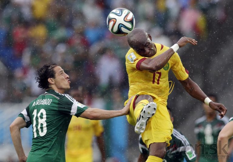 Mexický futbalista Andres Guardado v hlavičkovom súboji s Kamerunčanom Stephanom Mbiaom počas piatkového zápasu A-skupiny na MS vo futbale. Foto: SITA/AP