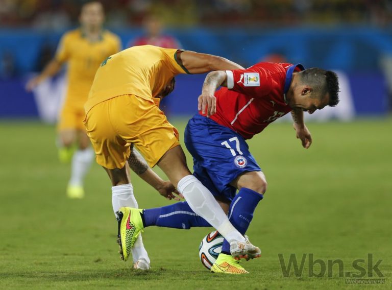 Čiľan Eduardo Vargas (11) v súboji s austrálskym futbalistom Markom Milliganom (5) počas piatkového zápasu B-skupiny na MS vo futbale. Foto: SITA/AP