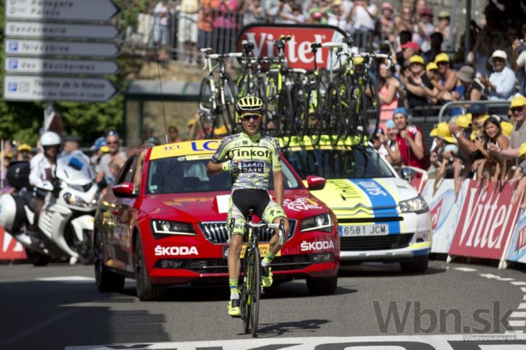 Rafal Majka oslavuje víťazstvo jedenástej etapy Tour de France, ktorá viedla z Pau do Cauterets a merala 188 kilometrov. Foto: SITA/AP