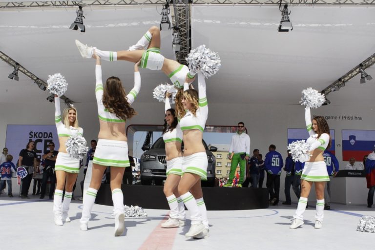 Vystúpenie Ice Girls vo fanzóne pred ostravskou ČEZ Arénou počas majstrovstiev sveta v ľadovom hokeji 2015 v Českej republike. Ostrava, Česká republika, 4. máj 2015. Foto: SITA/Ján Viazanička