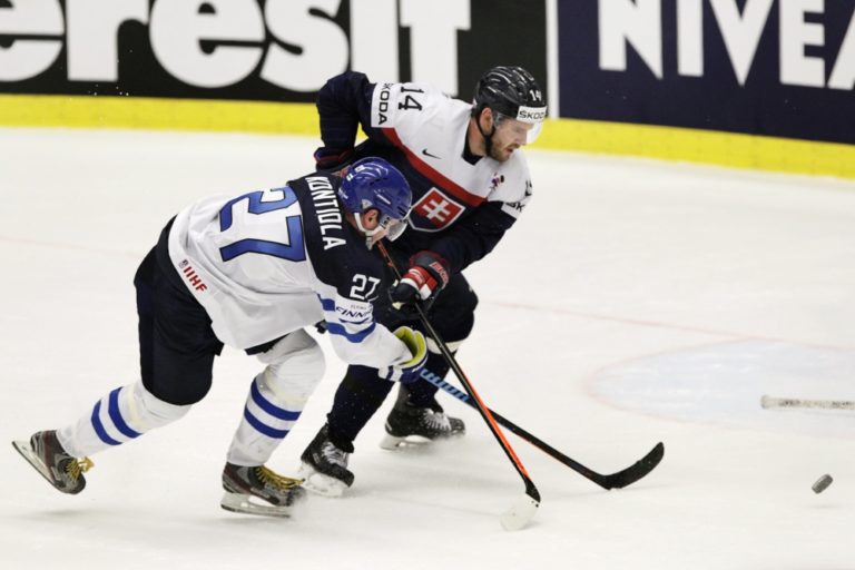 Fínsky útočník Petri Kontiola v súboji so slovenským obrancom Andrejom Meszárošom počas zápasu B-skupiny na svetovom šampionáte v Česku. Ostrava, 9. máj 2015. Foto: SITA/Ján Viazanička