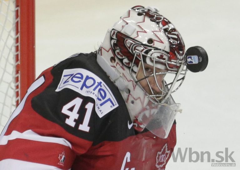 Brankár Mike Smith počas semifinálového zápasu na svetovom šampionáte v hokeji, v ktorom Kanaďania zdolali domáce Česko 2:0. Praha, 16. máj 2015. Foto: SITA/AP