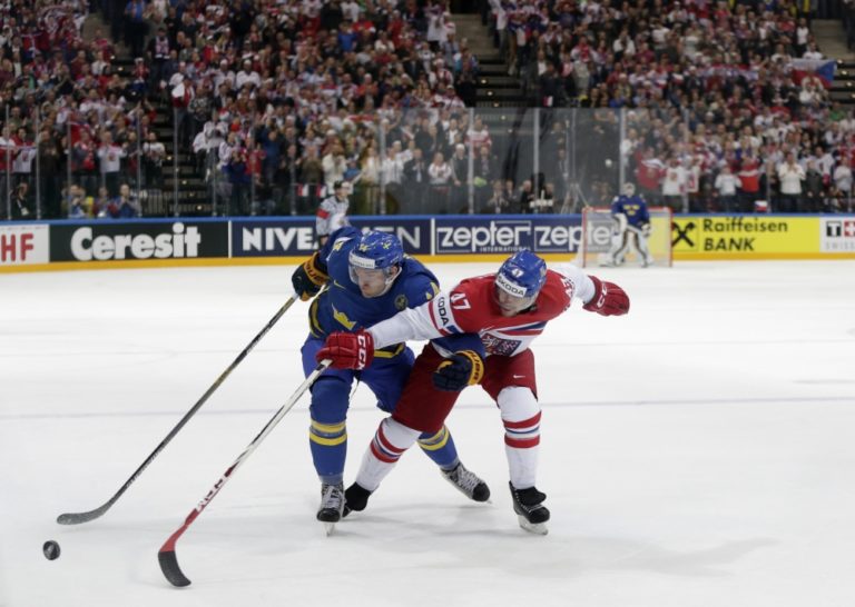 Český útočník Michal Jordán v súboji so Švédom Mattiasom Ekholmom počas zápasu na majstrovstvách sveta v hokeji. Praha, 1. máj 2015. Foto: SITA/AP
