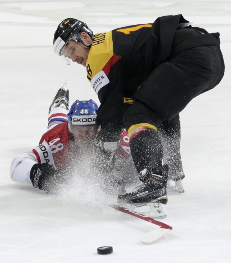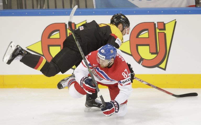 Český útočník Tomáš Hertl v súboji s Nemcom Kaiom Hospeltom počas zápasu A-skupiny na svetovom šampionáte v Česku. Praha, 10. máj 2015. Foto: SITA/AP