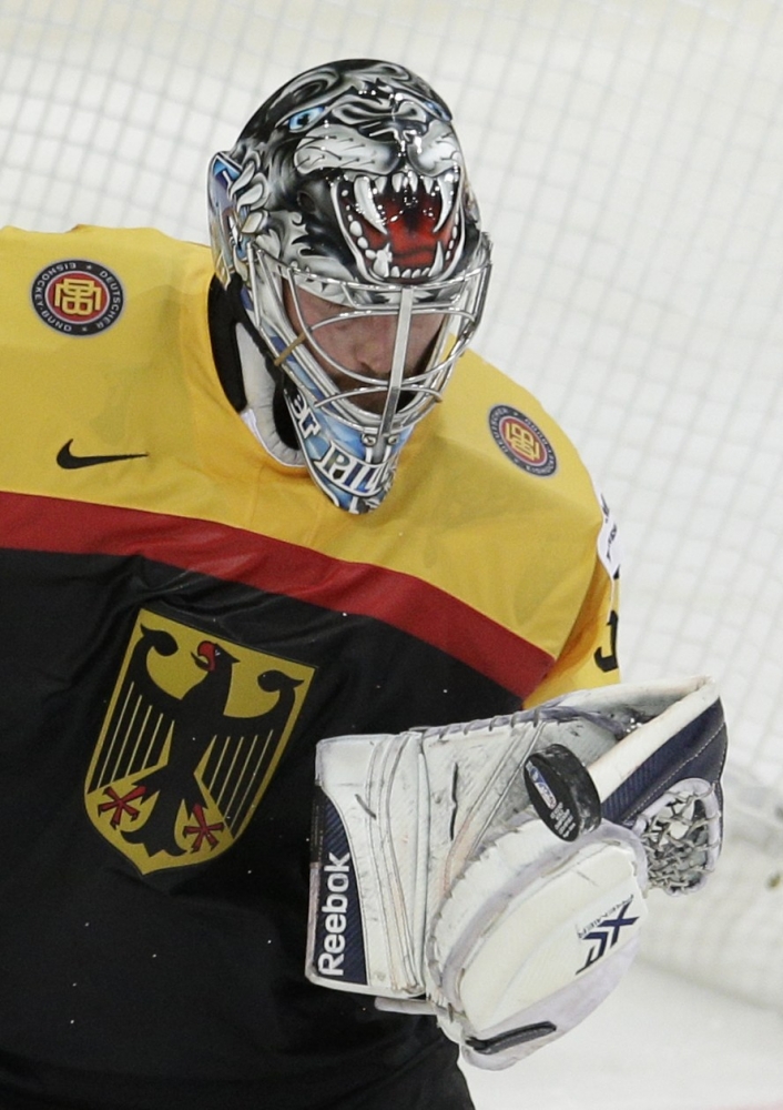 Nemecký brankár Timo Pielmeier chytá puk do lapačky počas zápasu A-skupiny na svetovom šampionáte v Česku. Praha, 10. máj 2015. Foto: SITA/AP