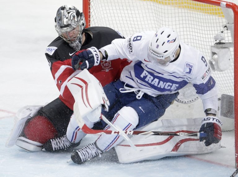 Zrážka francúzskeho útočníka Damiena Fleuryho s kanadským gólmanom Martinom Jonesom počas zápasu A-skupiny na svetovom šampionáte v hokeji. Praha, 9. máj 2015. Foto: SITA/AP