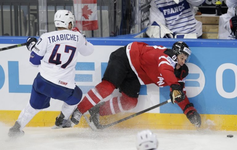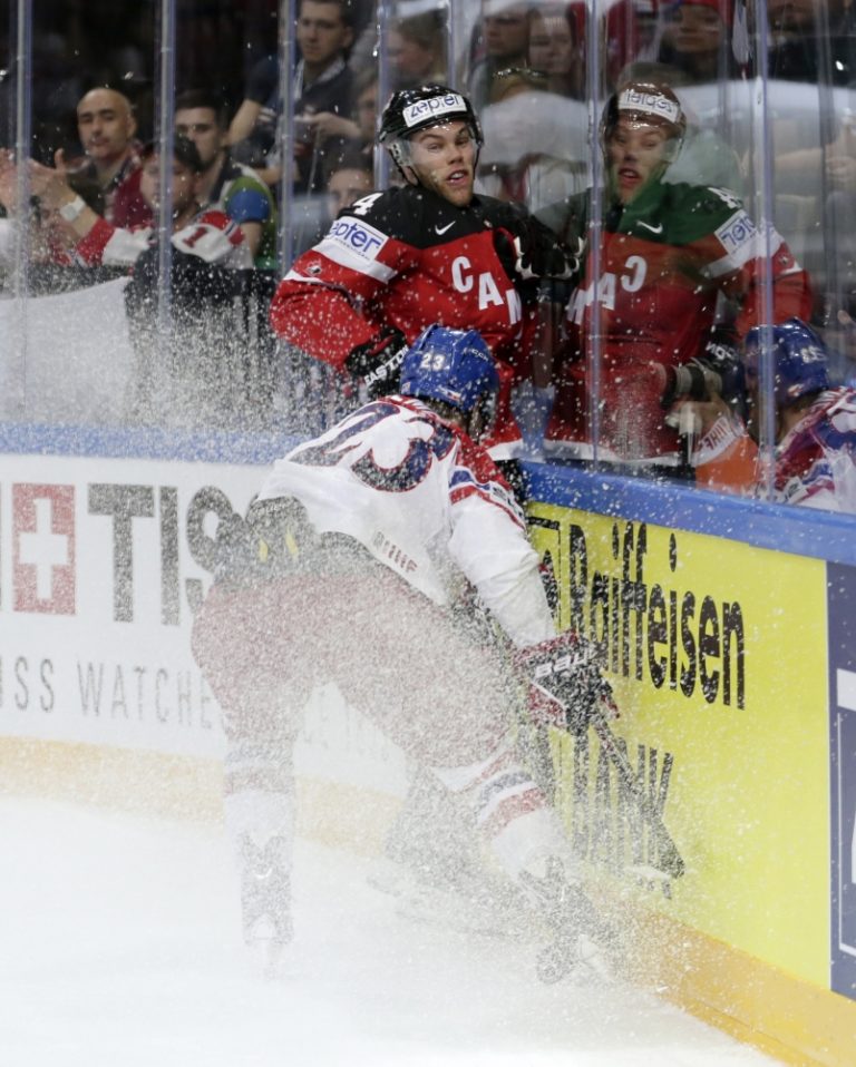 Francúzsky obranca Benjamin Dieude-Fauvel v súboji s Kanaďanom Braydenom Schennom počas zápasu A-skupiny na svetovom šampionáte v hokeji. Praha, 9. máj 2015. Foto: SITA/AP