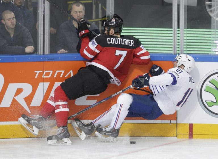 Kanadský útočník Sean Couturier v súboji s Francúzom Laurentom Meunierom počas zápasu A-skupiny na svetovom šampionáte v hokeji. Praha, 9. máj 2015. Foto: SITA/AP
