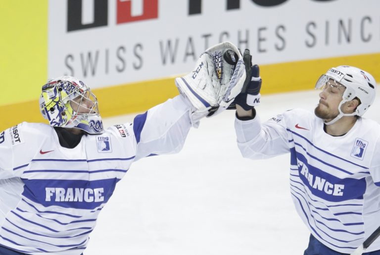 Francúzsky gólman Ronan Quemener chytá puk do lapačky počas zápasu A-skupiny na svetovom šampionáte v hokeji. Praha, 9. máj 2015. Foto: SITA/AP