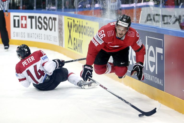 Rakúšan Peter Patrick v súboji so švajčiarskym útočníkom Dinom Wieserom počas zápasu A-skupiny na majstrovstvách sveta v Česku. Praha, 2. máj 2015. Foto: SITA/AP