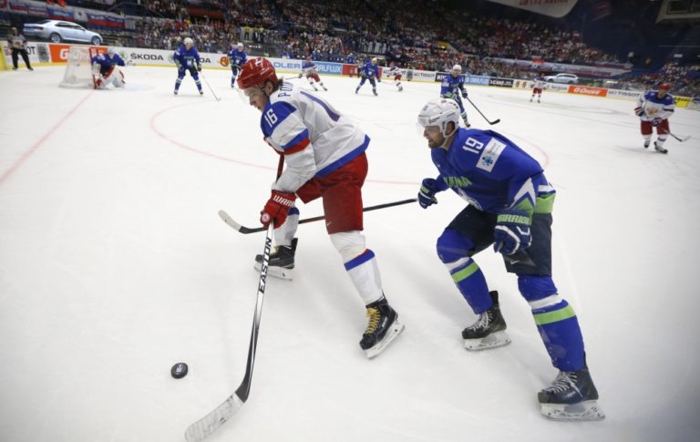 Ruský útočník Sergej Plotnikov v súboji so Slovincom Žigom Pancem počas zápasu B-skupiny na svetovom šampionáte v Česku. Ostrava, 3. máj 2015. Foto: SITA/AP