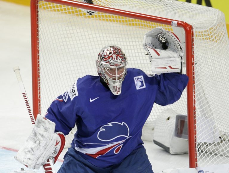 Francúzsky brankár Cristobal Huet chytá puk do lapačky počas zápasu A-skupiny na svetovom šampionáte v Česku. Praha, 3. máj 2015. Foto: SITA/AP