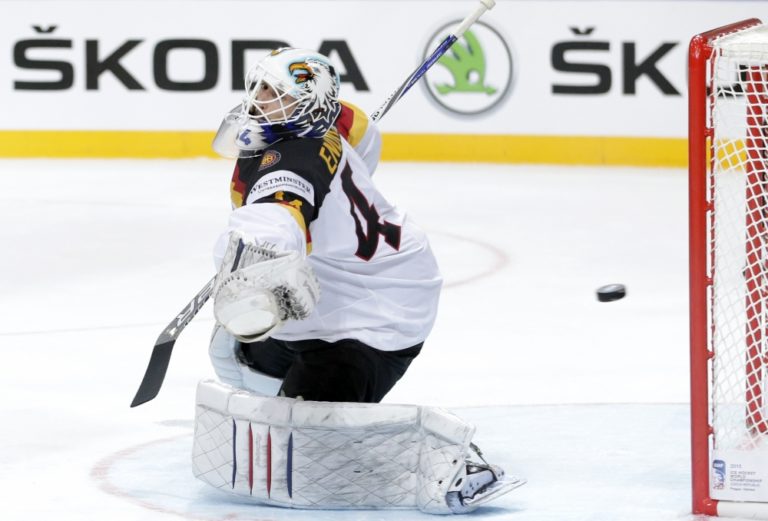 Zákrok nemeckého brankára Dennisa Endrasa počas zápasu A-skupiny na svetovom šampionáte v Česku. Praha, 3. máj 2015. Foto: SITA/AP