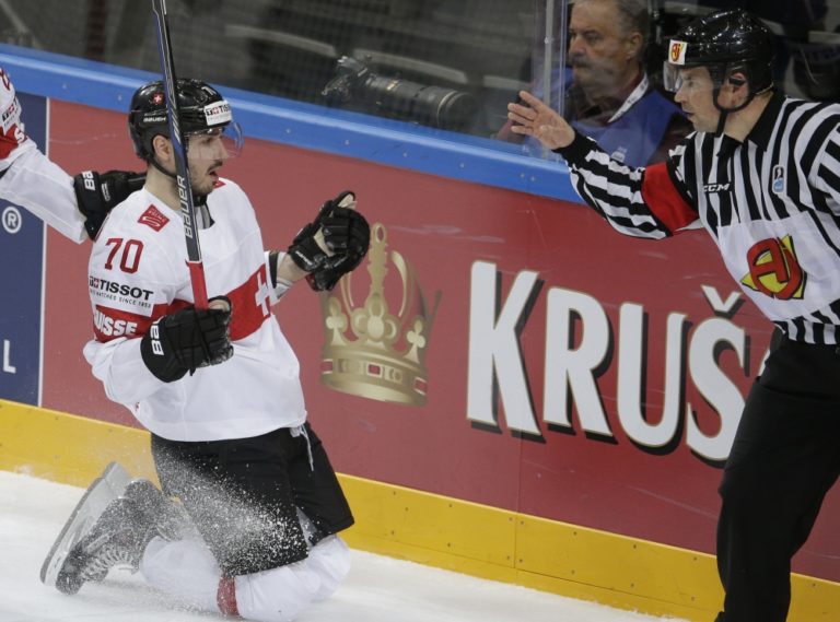 Švajčiar Denis Hollenstein sa teší z gólu, ktorý strelil Francúzom počas zápasu A-skupiny na svetovom šampionáte v Česku. Praha, 3. máj 2015. Foto: SITA/AP