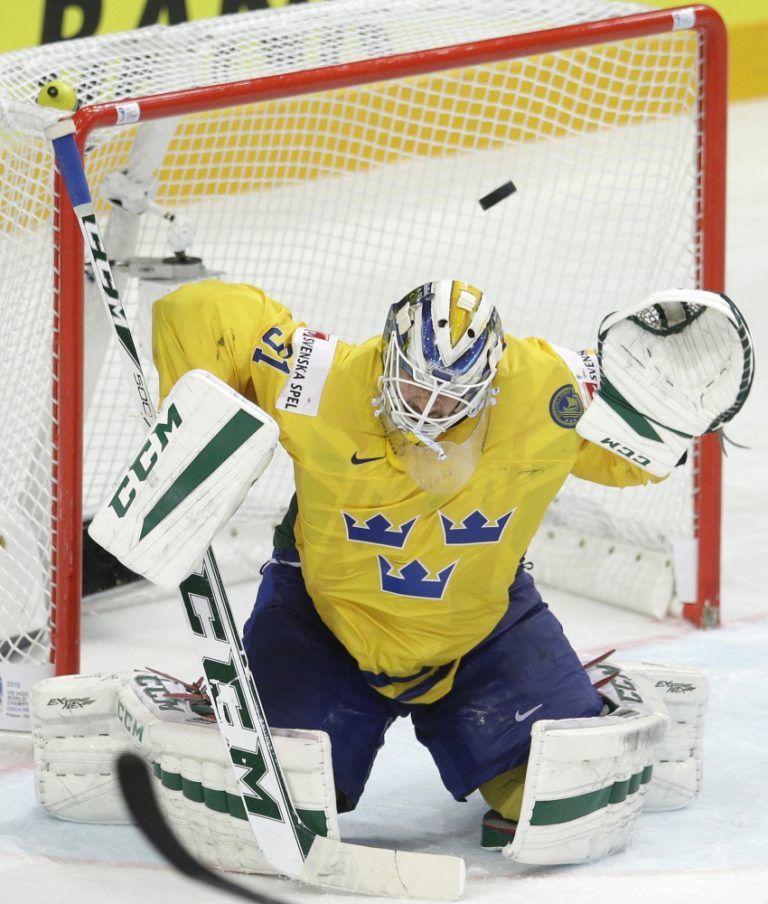 Puk po strele kanadského hokejistu Tylera Ennisa končí za chrbtom švédskeho gólmana Andersa Nilssona počas zápas A-skupiny na svetovom šampionáte v Česku. Praha, 6. máj 2015. Foto: SITA/AP
