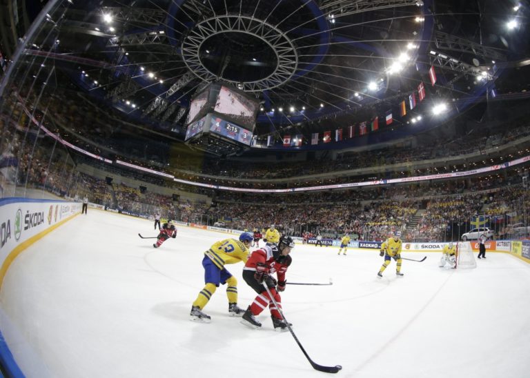Oscar Klefbom zo Švédska (vpravo) a Tyler Ennis z Kanady v súboji pri mantineli počas zápasu A-skupiny na svetovom šampionáte v hokeji. Praha, 6. máj 2015. Foto: SITA/AP