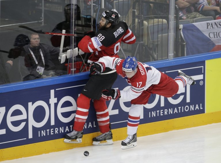 Český útočník Vladimir Sobotka v súboji s Kanaďanom Brentom Burnsom počas zápasu A-skupiny na svetovom šampionáte v Česku. Praha, 4. máj 2015. Foto: SITA/AP