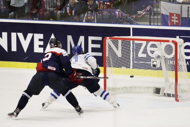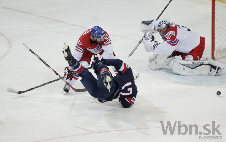 Americký útočník Ben Smith sleduje zákrok brankára Connora Hellebuycka počas zápasu B-skupiny na svetovom šampionáte v Česku. Ostrava, 12. máj 2015. Foto: SITA/Ján Viazanička