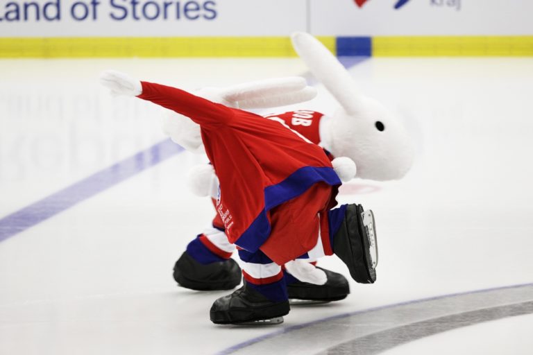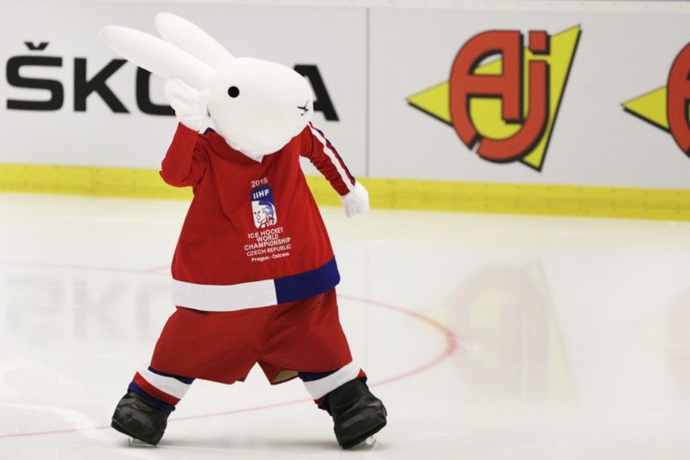 Maskot Bob pred zápasom základnej B-skupiny majstrovstiev sveta v ľadovom hokeji 2015 v Českej republike medzi Slovenskom a Dánskom. Ostrava, 2. máj 2015. Foto: SITA/Ján Viazanička