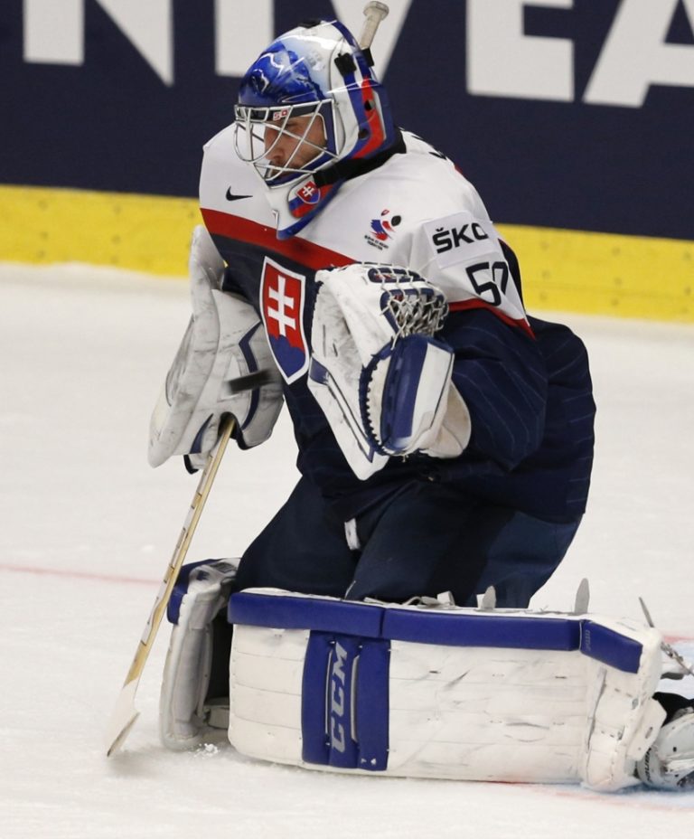 Zákrok slovinského brankára Roberta Kristana počas zápasu B-skupiny na svetovom šampionáte v hokeji. Ostrava, 5. máj 2015. Foto: SITA/Ján Viazanička