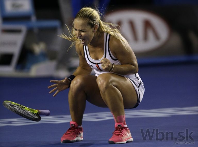 Slovenská tenistka Dominika Cibulková sa raduje z víťazstva po osemfinálovom zápase Australian Open, v ktorom zdolala Bielorusku Viktoriu Azarenkovú za 129 minút 6:2, 3:6, 6:3. Melbourne, 26. január 2015. Foto: SITA/AP