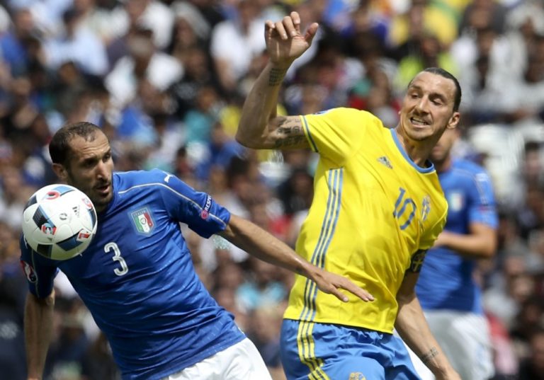 Švéd Zlatan Ibrahimovič (vpravo) v súboji s Talianom Giorgiom Chiellinim počas zápasu na majstrovstvách Európy. Toulouse, 17. jún 2016. Foto: SITA/AP