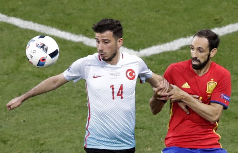 Hráč Turecka Oguzhan Ozyakup (vľavo) v súboji so Španielom Juanfranom počas zápasu na majstrovstvách Európy. Nice, 17. jún 2016. Foto: SITA/AP