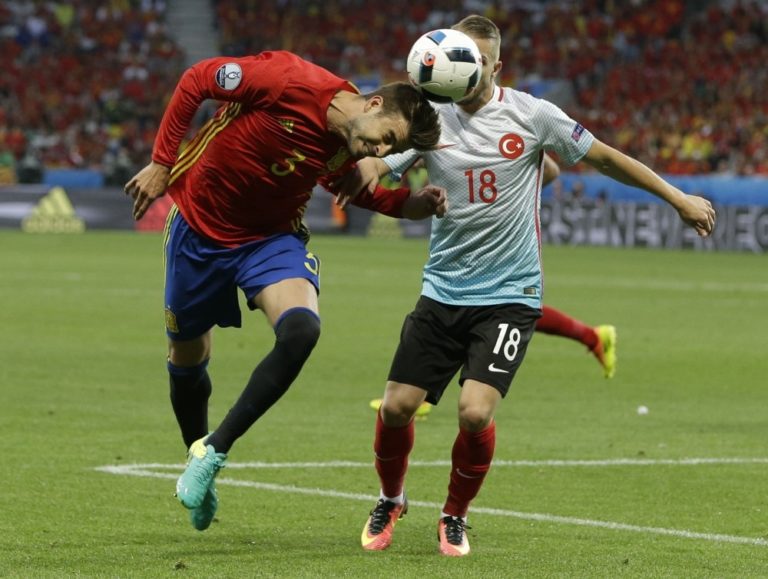 Hráč Španielska Gerard Pique (vľavo) v súboji s Turkom Canerom Erkinom počas zápasu na majstrovstvách Európy. Nice, 17. jún 2016. Foto: SITA/AP