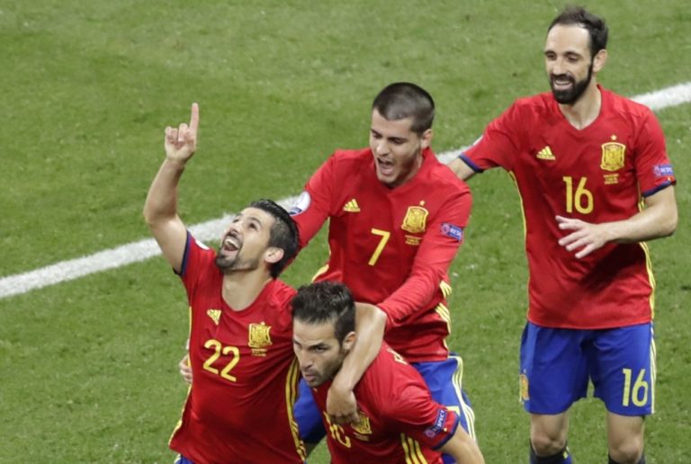 Radosť Španielov počas zápasu na majstrovstvách Európy. Nice, 17. jún 2016. Foto: SITA/AP