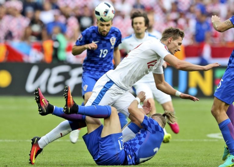 Čech Milan Škoda padá cez Chorváta Domagoja Vidu počas zápasu na majstrovstvách Európy. Saint-Etienne, 17. jún 2016. Foto: SITA/AP