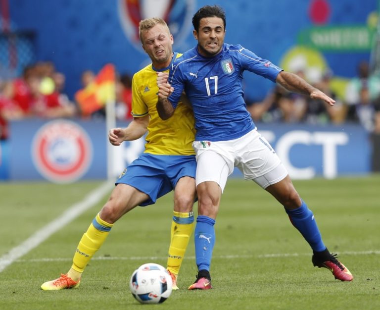 Švéd Sebastian Larsson (vľavo) v súboji s Talianom Ederom počas zápasu na majstrovstvách Európy. Toulouse, 17. jún 2016. Foto: SITA/AP