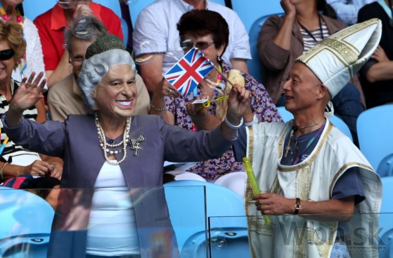 Fanúšikovia prezlečení za kráľovnú Alžbetu II. a pápeža Františka počas zápasu prvého kola Australian Open. Melbourne, 19. január 2015. Foto: SITA/AP