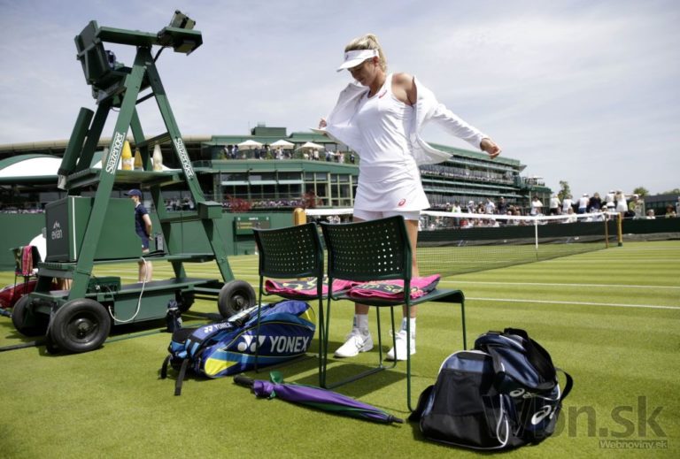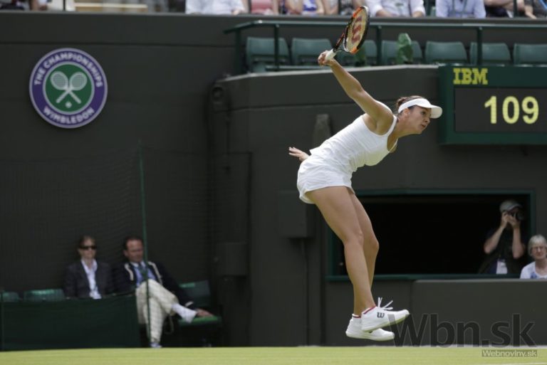 Slovenská tenistka Karolína Schmiedlová počas zápasu prvého kola na Wimbledone, v ktorom za 70 minút podľahla Američanke CoCo Vandeweghovej 4:6, 2:6. Londýn, 29. jún 2015. Foto: SITA/AP