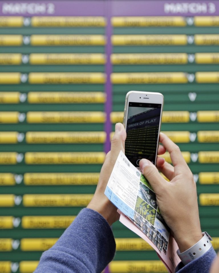 Návštevník All England Clubu si fotí program prvého dňa Wimbledonu. Londýn, 27. jún 2016. Foto: SITA/AP